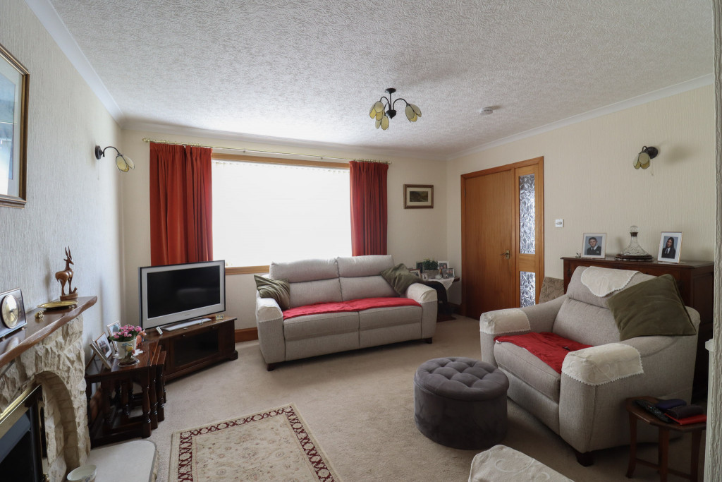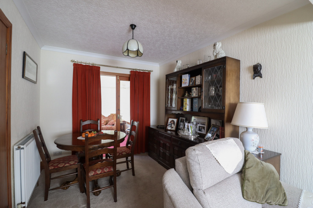 Spacious, light room with large window to the front with attractive elevated open views across town; stone built fire-place with a wooden mantel housing and a coal effect gas fire; television aerial connection; coving; smoke detector; carbon monoxide detector; natural wood finishes; telephone point; two wall lights; fitted carpet; radiator; opening through to the dining room.