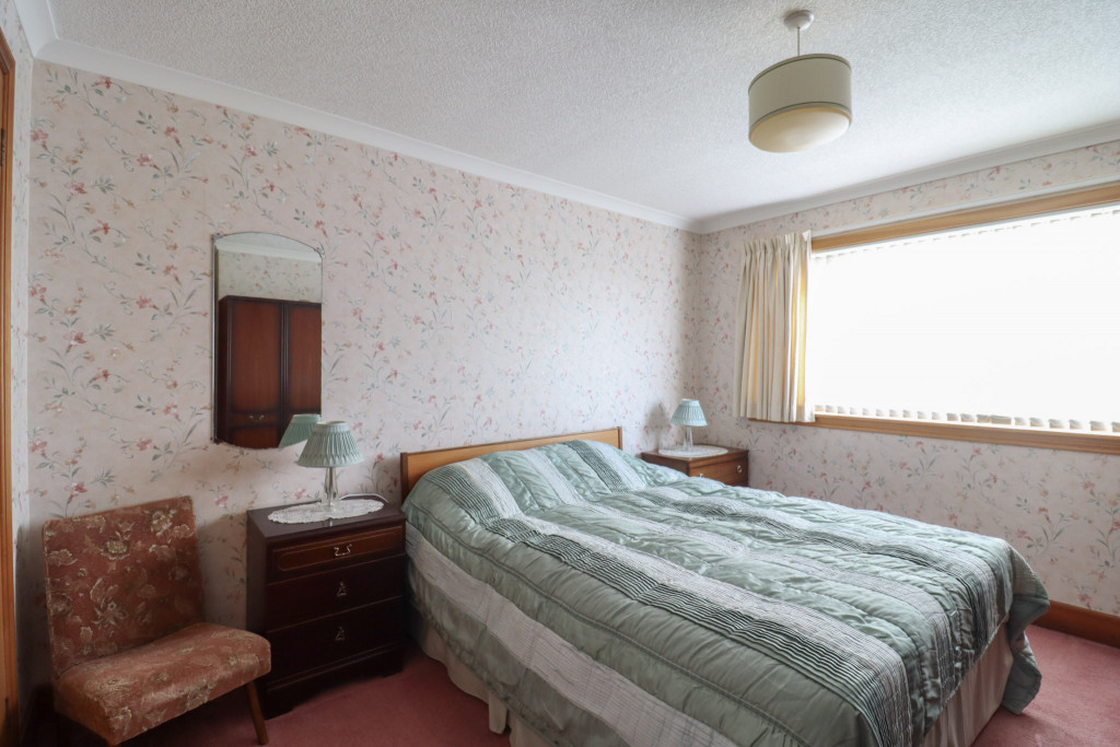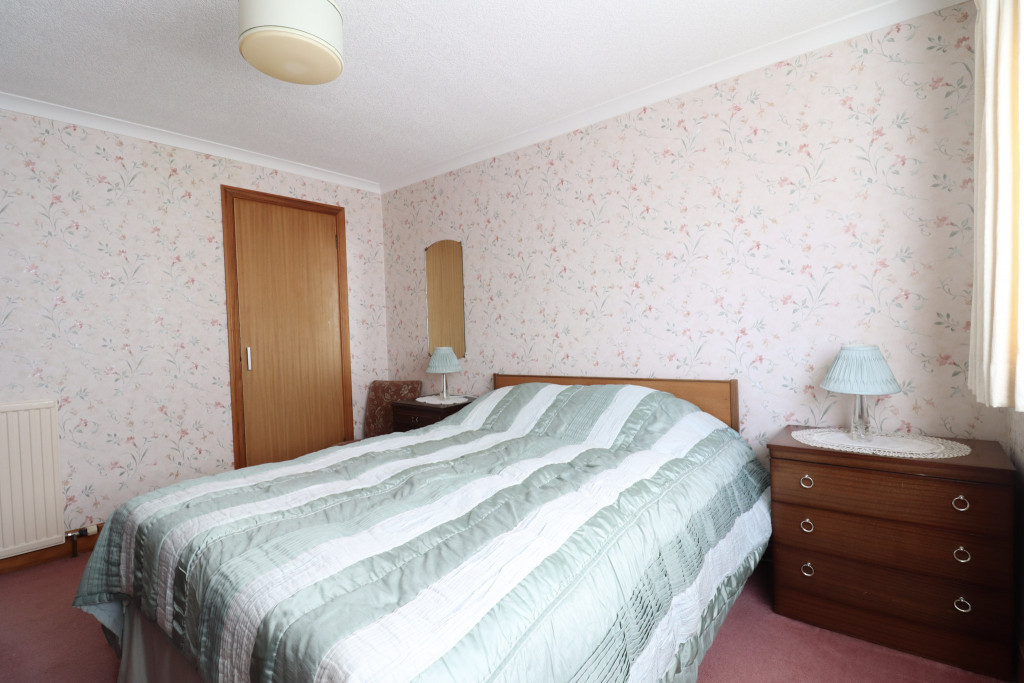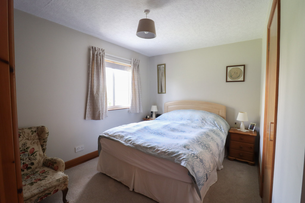 Double bedroom with window to the front and beautiful elevated views; built-in wardrobe with hanging space and shelf; natural wood finishes; coving; fitted carpet; radiator.