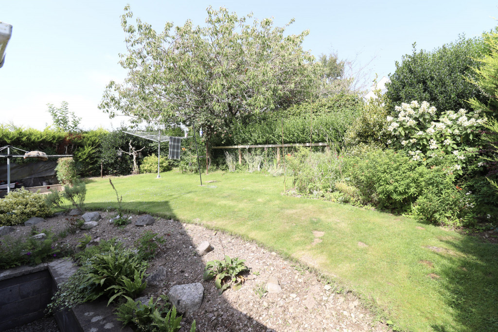 A paved and gravelled driveway leads to the garage and steps lead to the covered front entrance which has an outside light. The front garden comprises an assorted flower and shrub bed with gravel pathways to either side with a fence on one side and a small metal gate to the other. The rear garden has an area of lawn with attractive borders, paved seating area, wooden garden shed, rotary washing line, outside water tap and outside lights.