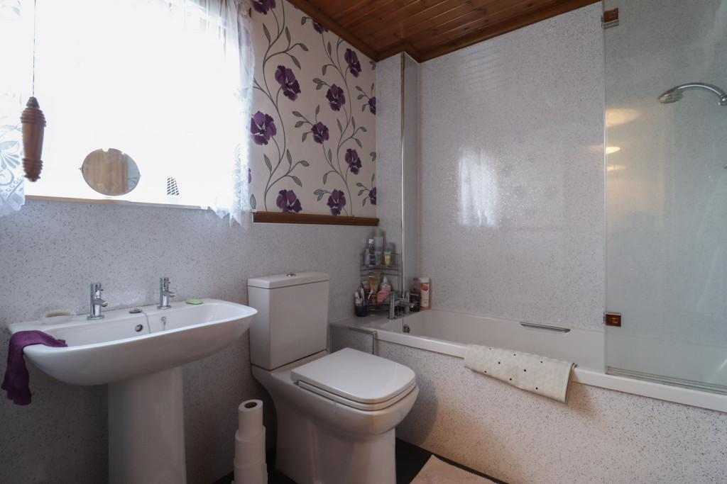 Obscure glazed window; modern suite of bath with Mira mains shower over, waterproof wall panelled surround and a folding screen, WC and wash-hand basin with splash-back; natural wood lined ceiling; chrome radiator towel rail.