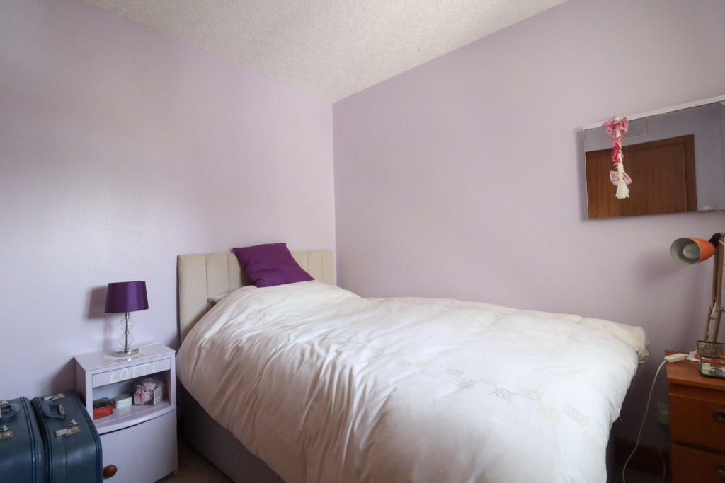 Double bedroom with window to the rear; built-in wardrobe with hanging space and shelf; natural wood finishes; radiator.