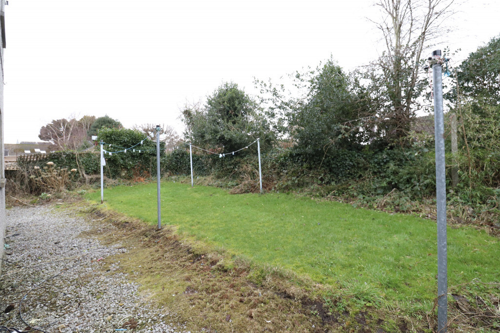 Steps from the street lead up to the communal entrance door. Small area laid to lawn. Paved pathways at either side of the building lead to the shared garden/drying green.