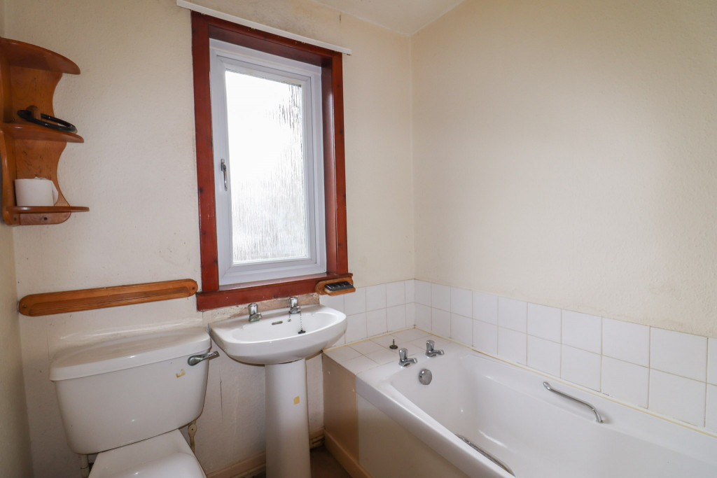 Obscure glass window to side. White W.C., wash hand basin and bath. Tiled splashback at bath. Dimplex wall mounted heater. Extractor fan. Heated chrome towel rack. Shelving. Towel ring and rail.