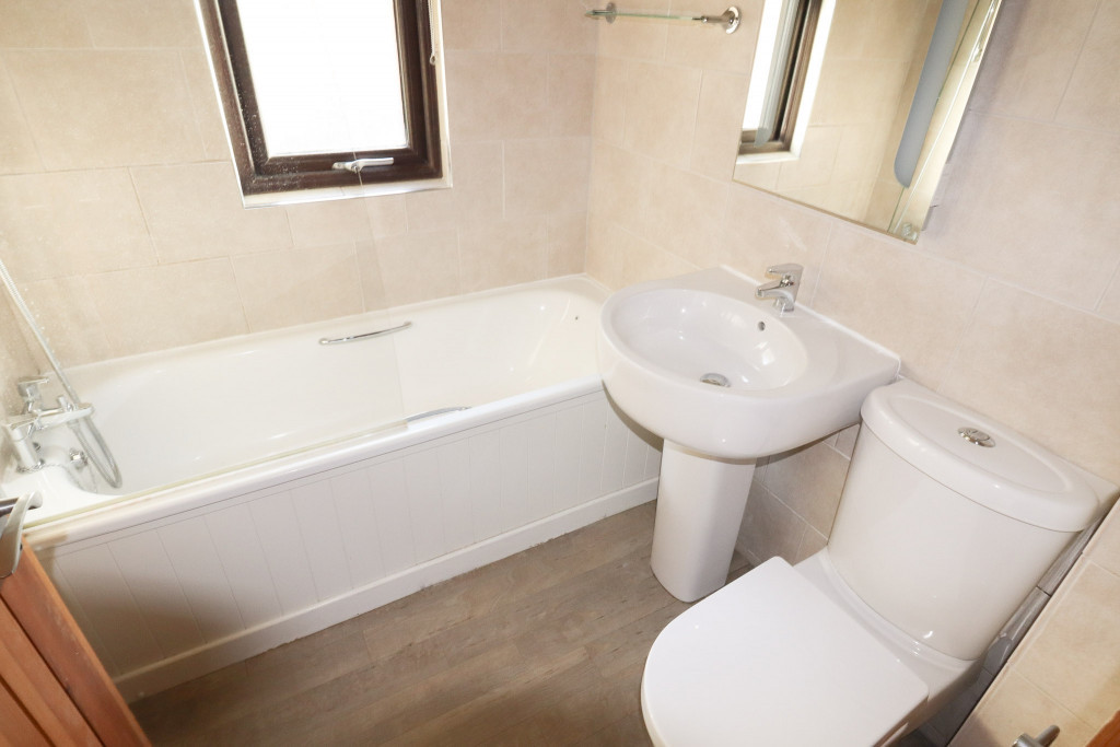 Modern fitted suite of W.C, wash hand basin and shower over bath with glass screen; tiles to 2 walls; obscure window to side; heated towel rail; wall mounted mirror; wood effect flooring.