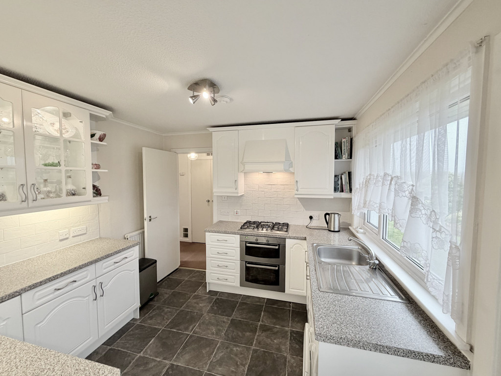 Bright room with window to the rear overlooking the garden; white wooden fitted wall and floor units including glass fronted and corner shelved units, under unit lighting, complementing stone effect worktop and a white tiled splash-back; built-in stainless steel Whirlpool cooker with a 5 ring gas hob and extractor hood above; stainless steel sink unit and drainer; integrated fridge; Bosch washing machine; coving; smoke detector; vinyl flooring; radiator; part obscure glazed UPVC external door to the rear garden.