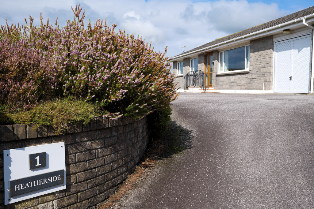 A sweeping tarmac driveway leads to the garage and sizeable tarmac parking area. There is an area of lawn with flower and shrub borders at the front which extends round the side of the property where there is a screened paved seating area providing fantastic uninterrupted views. A pathway continues to the rear garden which is also laid largely in lawn with flower and shrub borders, a wooden potting shed and a paved seating area where views can also be enjoyed. There is a concrete hardstanding at the other side of the property with an outside water tap. Outside lights.