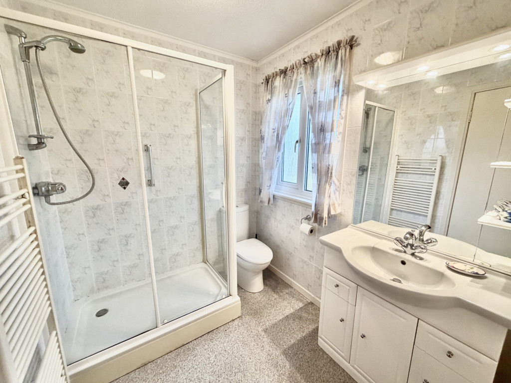 Obscure glazed window to the rear; modern white suite of w.c. and wash-hand basin in vanity unit with downlit fitted vanity mirror and shelving; shower cabinet with Mira mains shower with a tiled surround; full tiling to walls; coving; towel rail radiator; non-slip flooring; radiator.