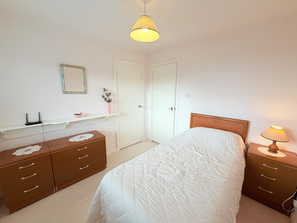 Single bedroom with window to the front; built-in wardrobe with hanging space and shelf above; fitted storage shelf; coving; fitted carpet; radiator.