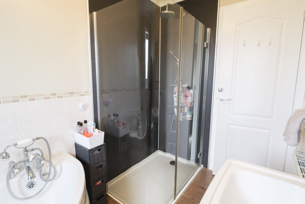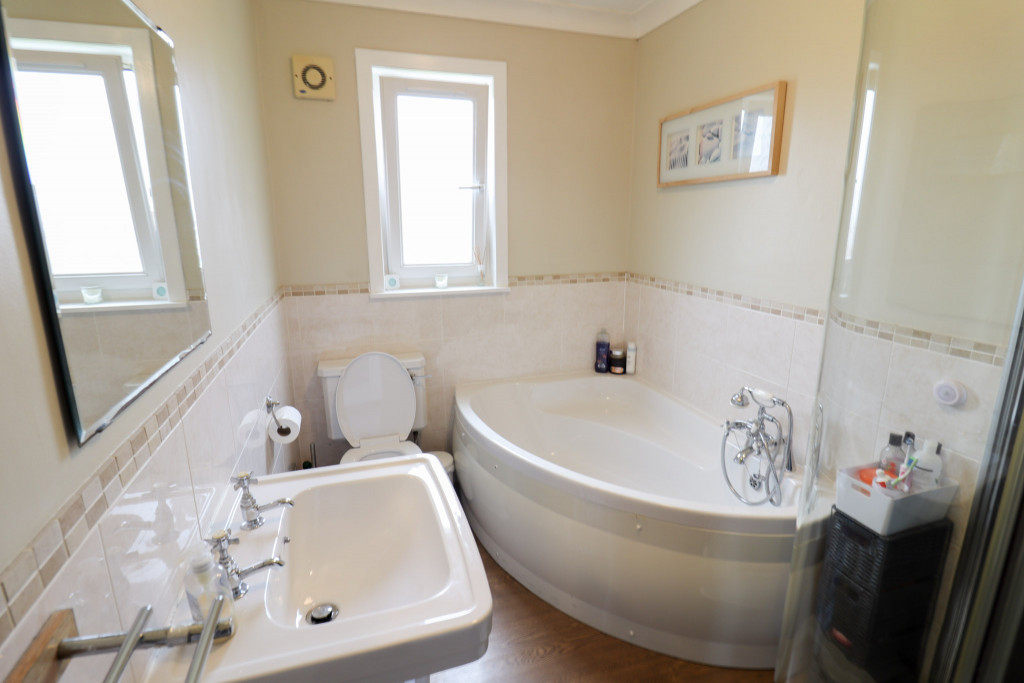 Obscure glazed window to the rear; white suite of corner bath, w.c. and wash-hand basin; good sized shower cabinet with a Mira mains dual head shower with waterproof wall panelling; half height tiling to walls; fitted wall mirror; extractor fan; coving; laminate flooring; radiator.