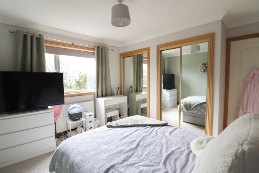 Double room with window to the front; two built-in double wardrobes comprising hanging space, shelf and mirror fronted sliding doors; coving; fitted carpet; white panelled door to the hall; radiator.