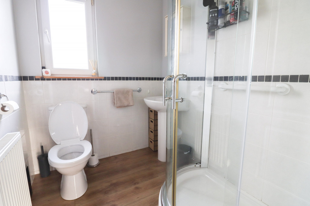 Obscure glazed window; white suite of w.c. and wash-hand basin; good sized shower cabinet with Mira Sport shower and tiled surround; half height tiling to walls; extractor fan; coving; laminate flooring; radiator.
