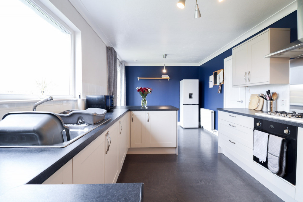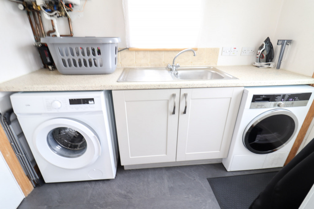Window to the side; stainless steel sink unit and drainer with a cream coloured floor unit, complementing worktop and splash-back; space for washing machine and tumble dryer; Navien gas central heating boiler; extractor fan; built-in storage cupboard with coat hooks and shelf above; coving; carbon monoxide alarm; laminate flooring; part obscure glazed wooden door to the rear garden.