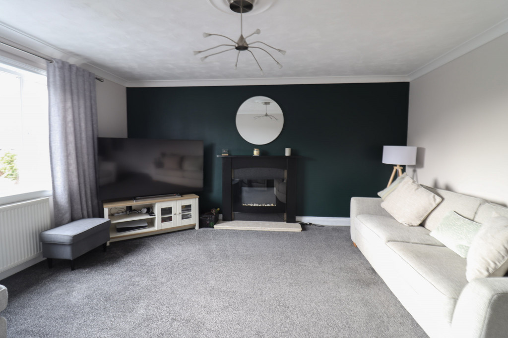 Spacious, light room with large window to the front; wooden fire-place with a marble effect hearth housing an electric fire; coving and centre rose; smoke detector; fitted carpet; radiator; part glazed wooden door to the hall.