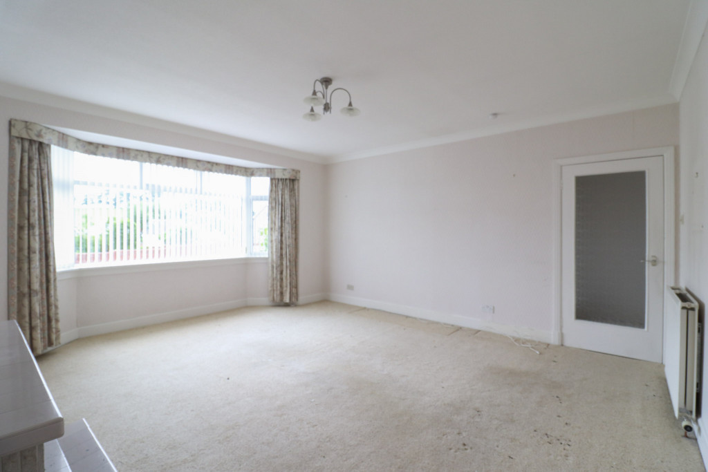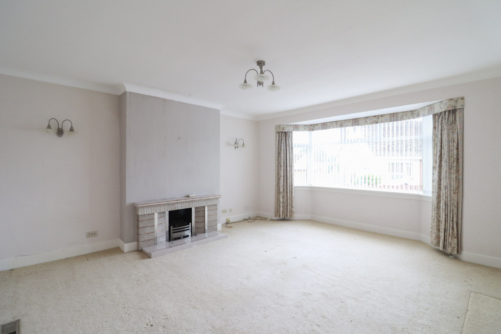 Spacious, light filled room with bay window to the front; tiled fire-place with gas fire; television aerial connection; coving; smoke detector; two wall lights; fitted carpet; radiator.