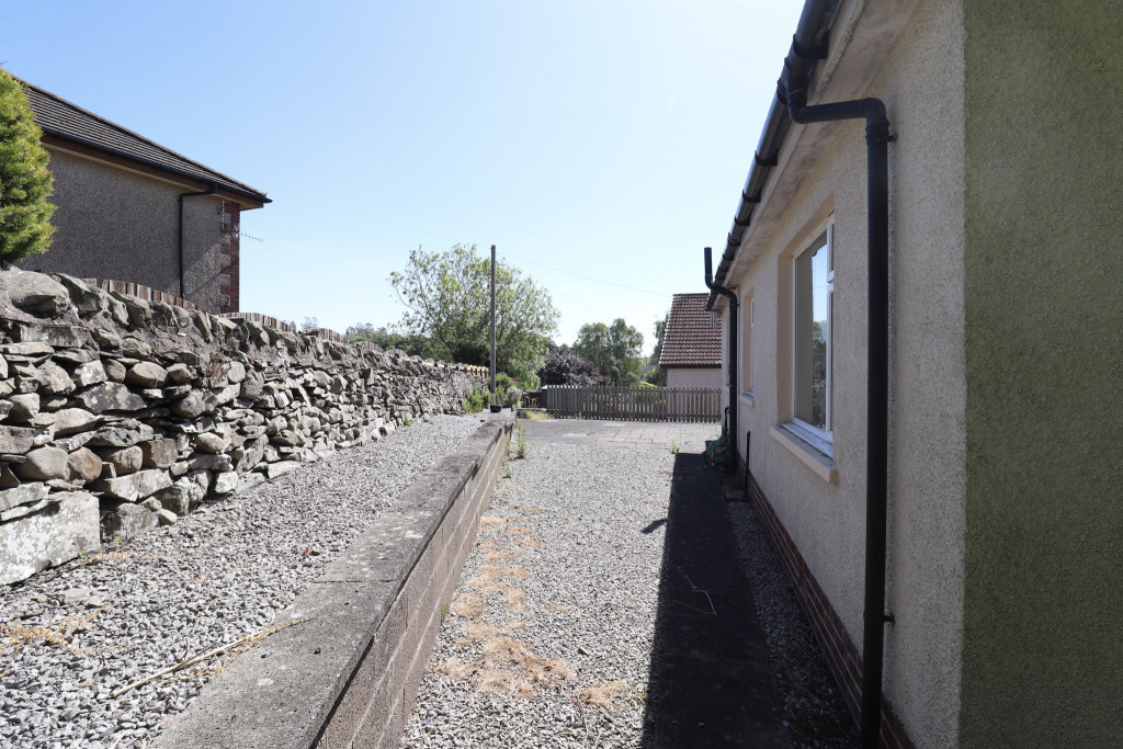 A paved and gravelled driveway leads to the garage. The front garden is laid to gravel with paved pathways which continue alongside the property with a gravel border to the rear garden. Storage shed.