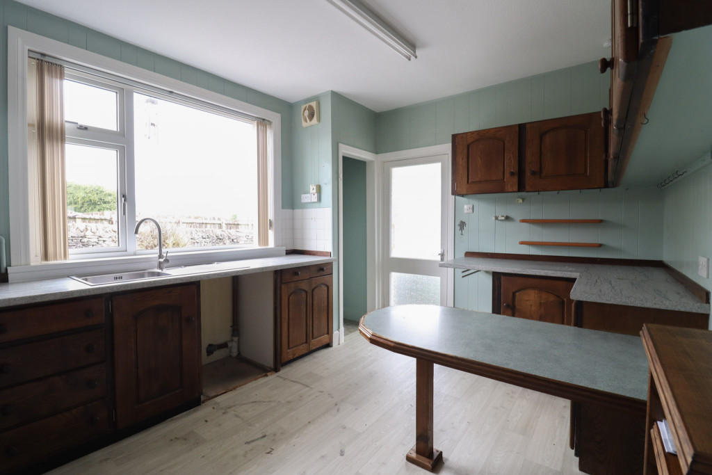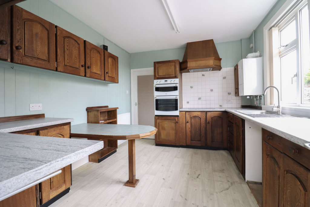 Window to the rear; range of fitted wall and floor units with a complementing worktop extended to include a breakfast bar area; stainless steel sink unit and drainer; Belling double oven, Blomberg electric hob with extractor hood above; tiled splash-back; Worcester gas central heating boiler; carbon monoxide alarm; extractor fan; smoke detector; laminate flooring; radiator; obscure glass door to the rear porch.