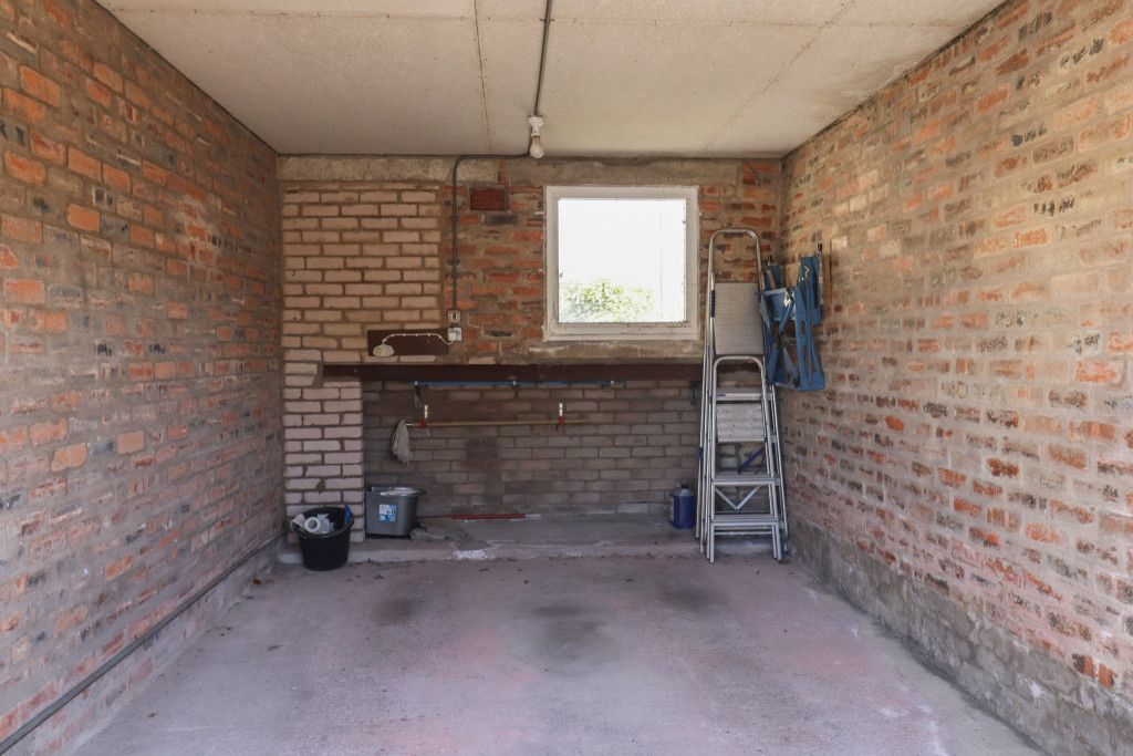Attached single garage of brick construction; flat, fibreglass covered roof; up and over vehicular access door to the front; window to rear; power and light; fuse box and meters.