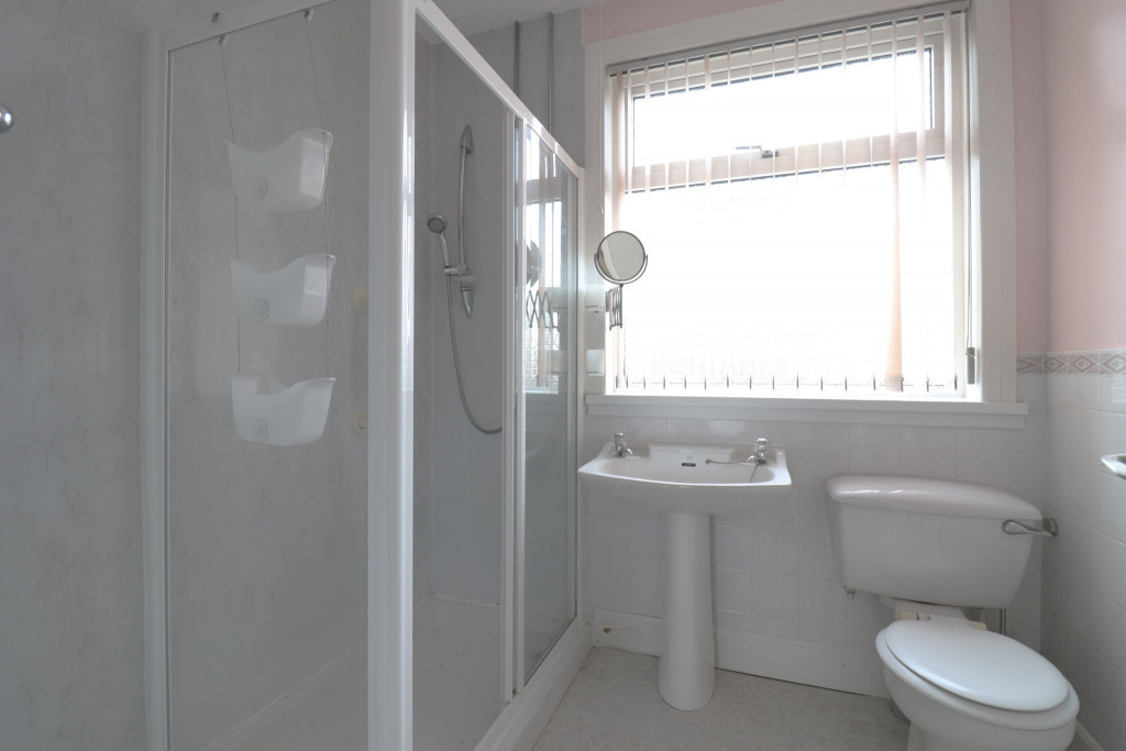 Obscure glazed window; white suite of w.c. and wash-hand basin; shower cabinet with mains Mira shower, waterproof wall panelled surround; extractor fan; half height tiling to walls; vinyl flooring; radiator.