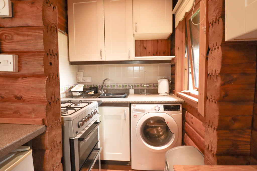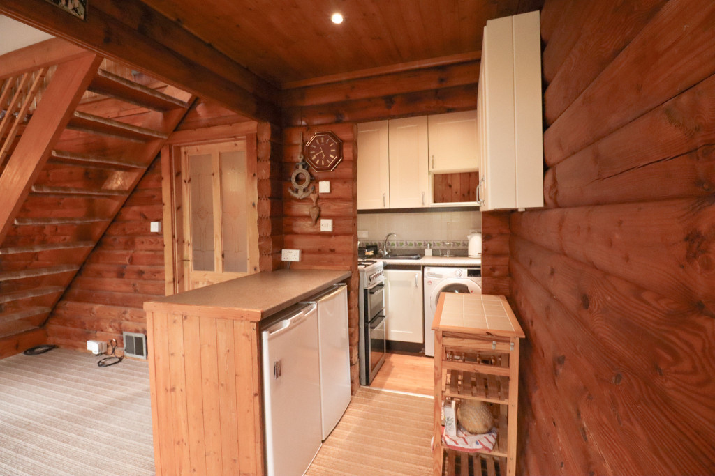 Wooden double glazed window to side with roller blind. A range of floor and wall mounted units. Tiled splashback. Stainless steel sink with single drainer. Flavel electric cooker with gas hob, Hoover washing machine, Fridgemaster under counter fridge and Proline under counter freezer. Heat alarm and fire blanket. Thermostat.