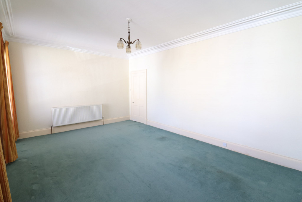 Spacious, light room with secondary glazed window to the front with a wood panelled surround; shelved recess with storage cupboard under; television connection; cornicing; picture rail; smoke detector; carbon monoxide detector; fitted carpet; radiator.