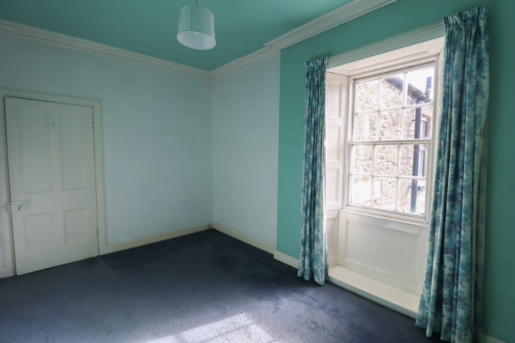 Spacious, light room with two single glazed windows to the front, one with storage cupboards under; stone built fire-place; cornicing; fitted carpet; radiator.