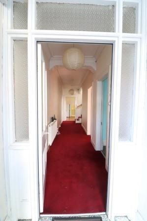 Traditional, solid wood, external front door with window above; meters and fuse box; cornicing; vinyl flooring; part obscure glass inner door and side screens to hall.