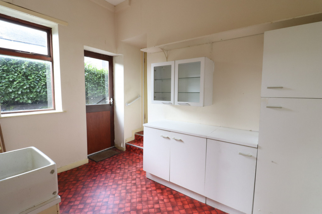 Single glazed window to the side; deep Belfast sink unit with storage cupboards under and range of white fitted wall and floor units; space and plumbing for washing machine; vinyl flooring; part glazed wood external door to the garden and doorway through to the store room.