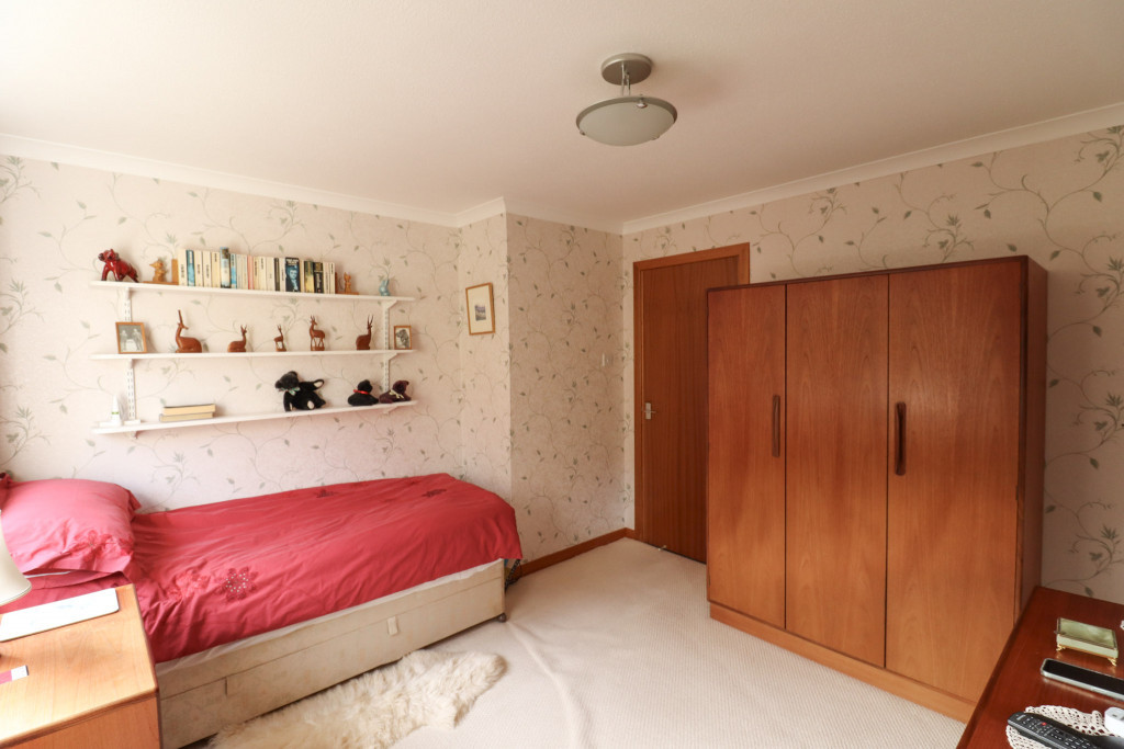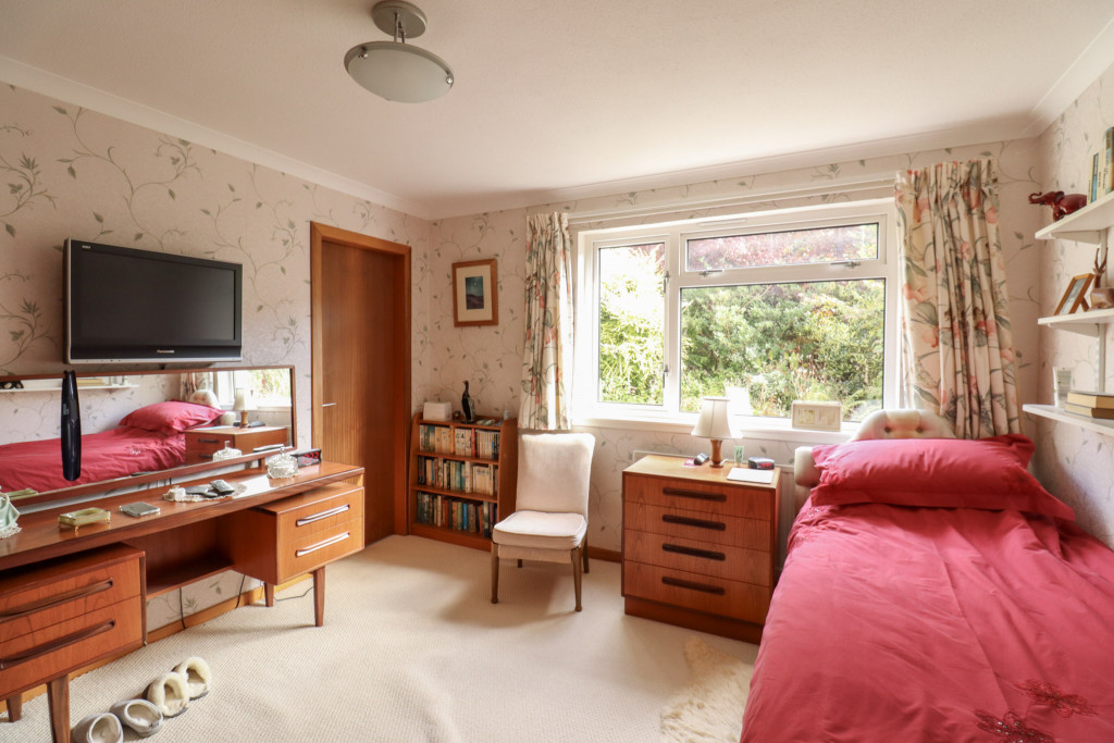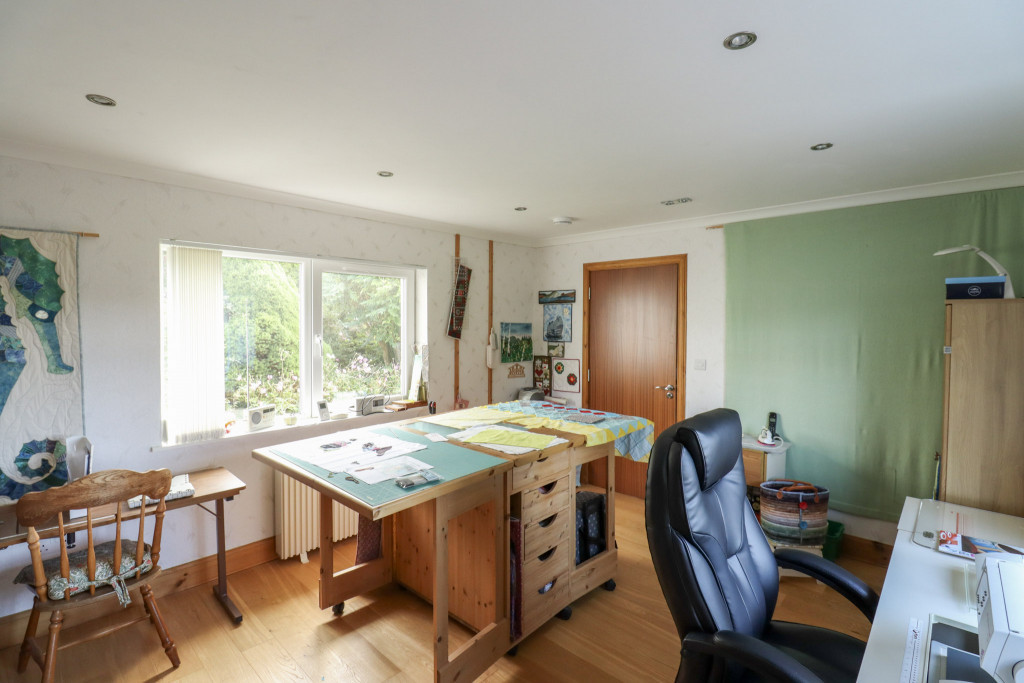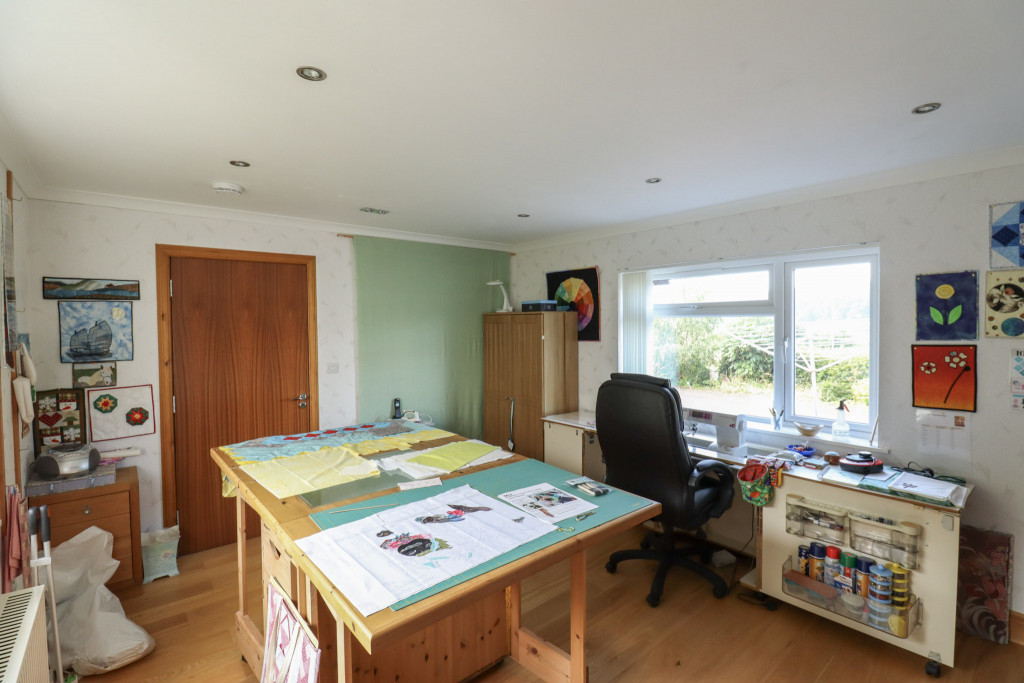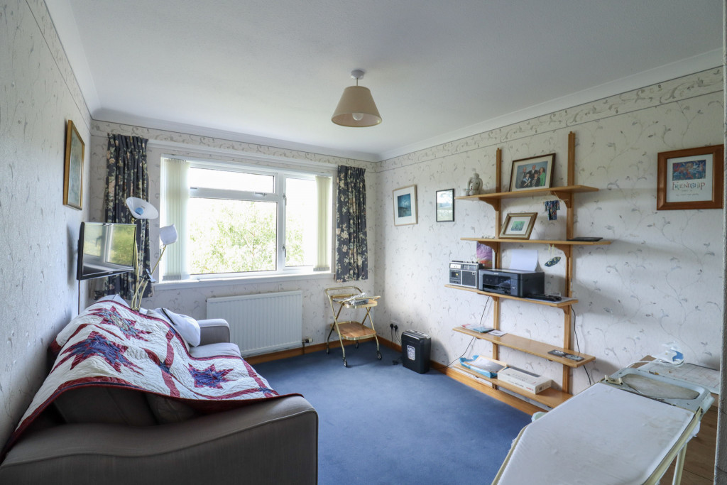 Currently used as a craft room, this room could also be used as an additional bedroom or office space. Windows to front and to rear, both with vertical blinds. Central heating radiator. Smoke alarm. Gas fire with tiled hearth and stone surround. Television point and telephone point. Shelving.