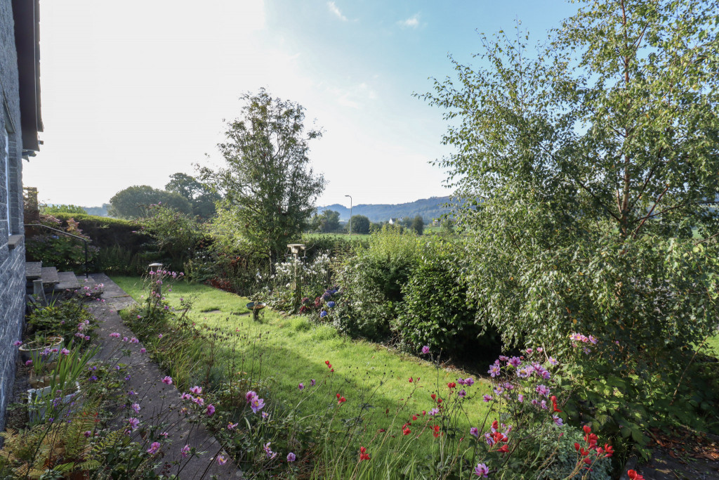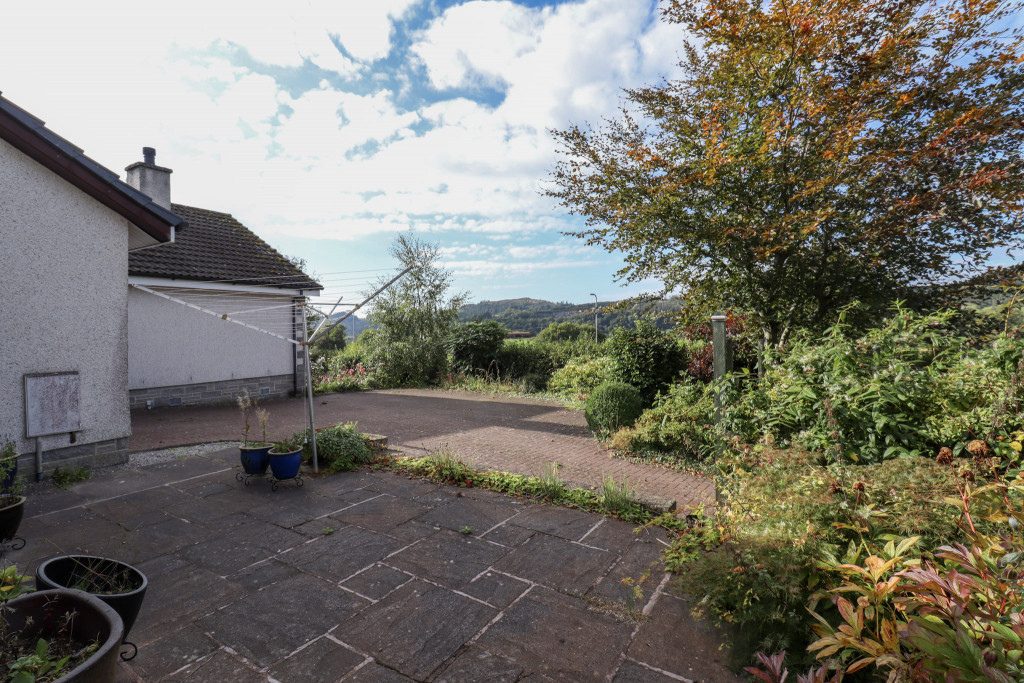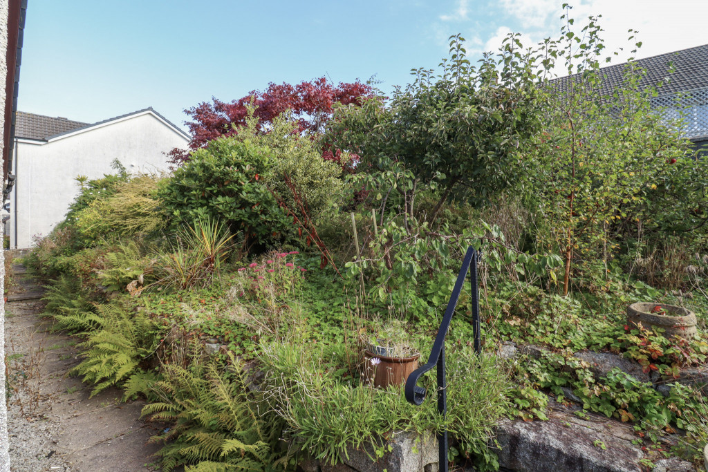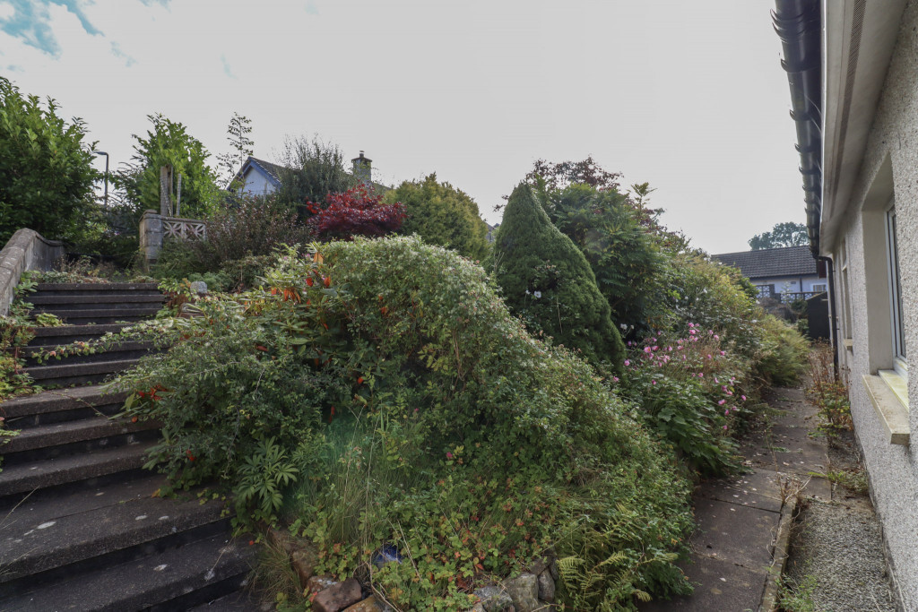 The garden to the front of the property is laid to lawn with a border of mature shrubs, bushes, hedges and small trees. Paved driveway with space for several vehicles. Small patio with rotating clothes dryer. Gas and electric meters. Outdoor light. A paved path leads around the side of the property to the rear garden.