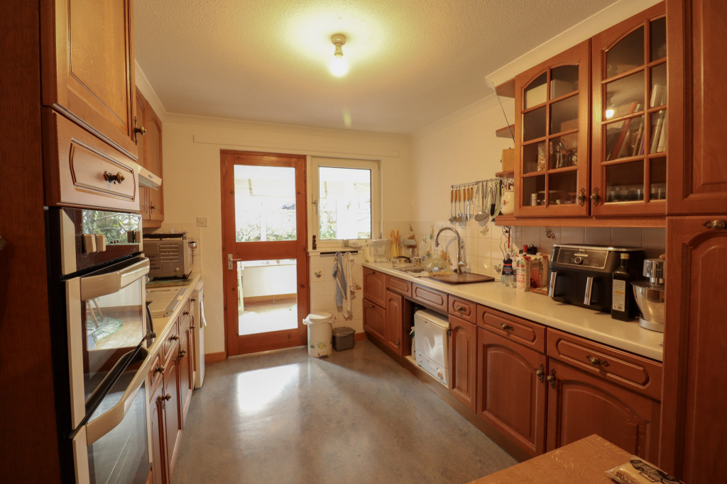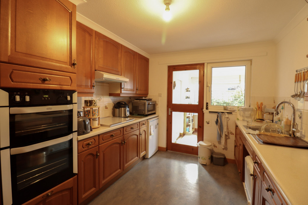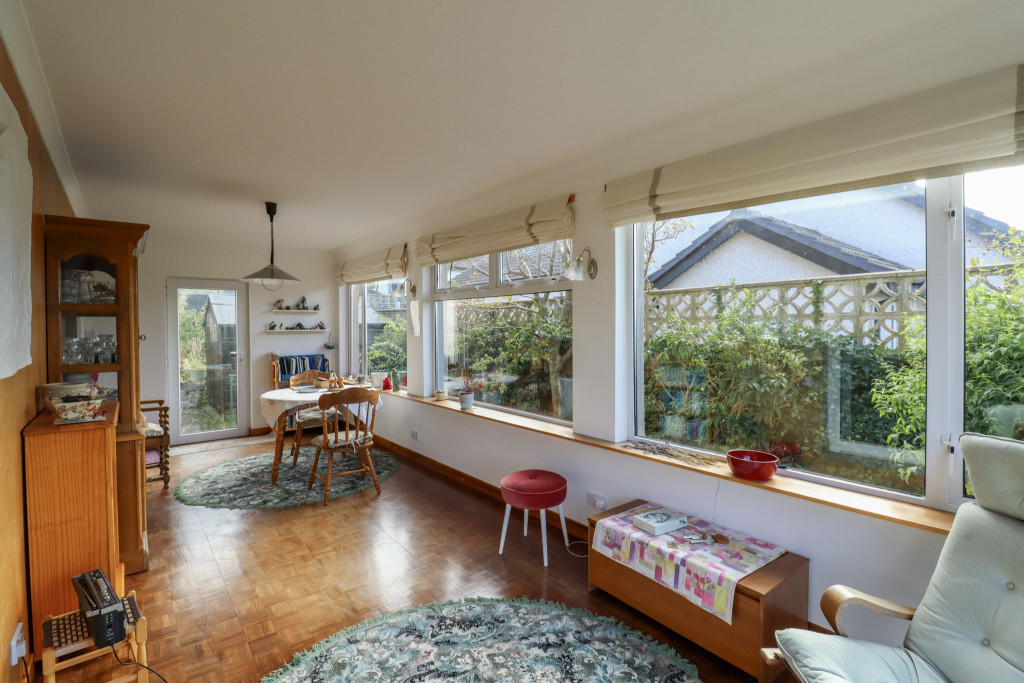 Bright and generously sized room. UPVC double glazed sliding patio doors to front, giving access to the front garden. 3 windows to side with roman blinds. 2 wall lights. UPVC double glazed door to rear, giving access to the rear garden. Glazed door to side into kitchen.