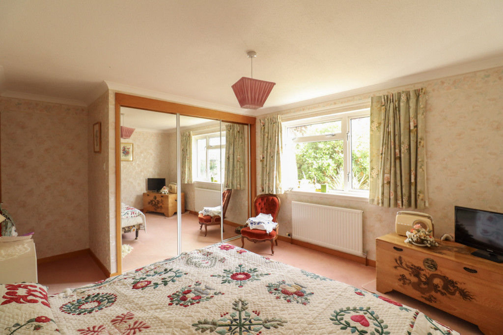 Window to front with vertical blind. Central heating radiator. Built in double wardrobe with mirrored doors, hanging rail, light and shelving. Television point.