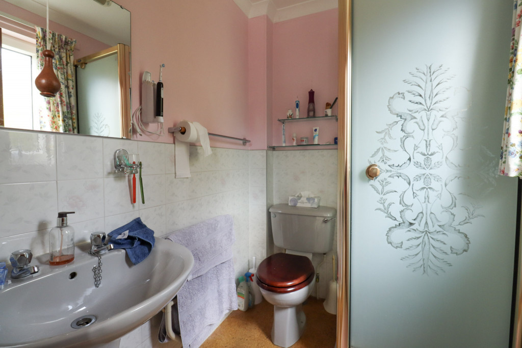 Obscure glass window to rear. Suite of W.C., wash hand basin and shower cubicle with Mira Excel shower. Tiling to half height and respatex to ¾ height at shower cubicle. Central heating radiator and heated chrome towel rack. Towel rail and towel ring. Shaving light/point. Coat hooks. Shelving. Mirror.