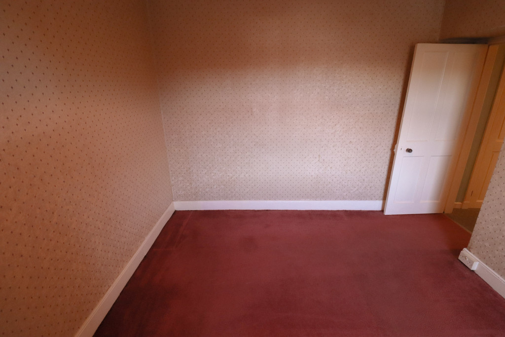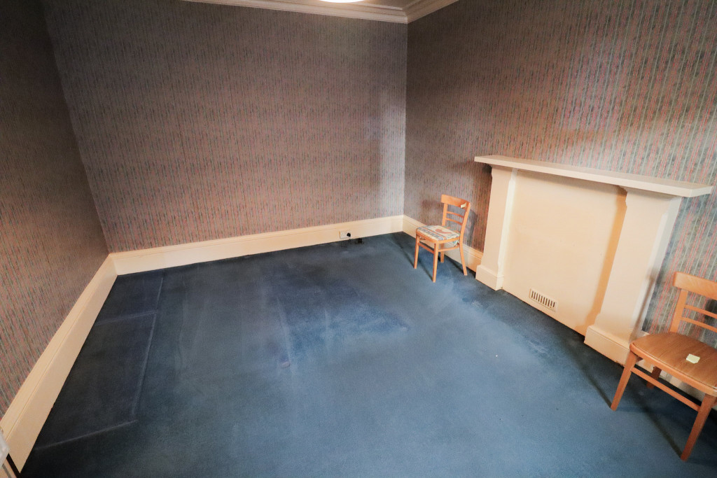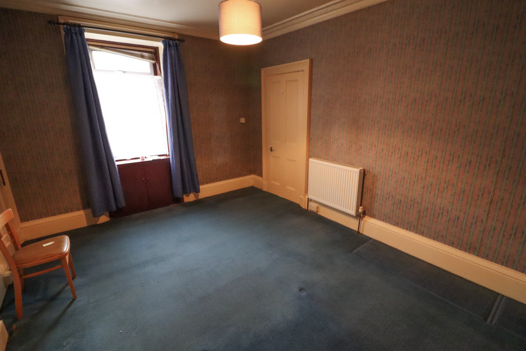 Window to front with built-in storage cupboards under; traditional wooden fire-place (blocked off); built-in shelved storage cupboard; cornicing; fitted carpet; radiator.