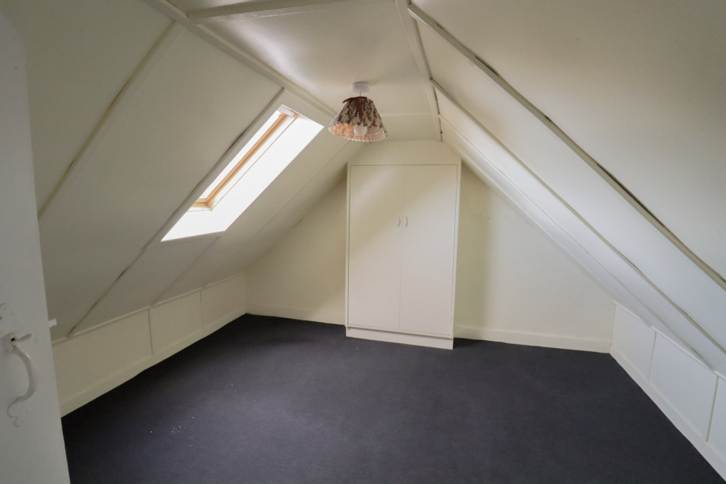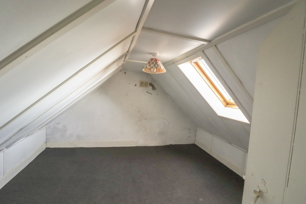 A steep carpeted staircase, lit by a Velux roof window, leads to the attic floor landing with built-in storage cupboard and doors leading to the two attic rooms.