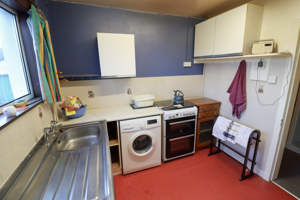 Bright room with window to the rear overlooking the garden; stainless steel sink unit and drainer with storage cupboards under, worktop and two matching wall units; tiled splash-back; Logic washing machine; Indesit gas cooker; smoke detector; carbon monoxide detector; built-in shelved storage cupboard also storing the Worcester gas central heating boiler and central heating control; vinyl flooring; obscure double glazed external door to the rear garden; radiator.