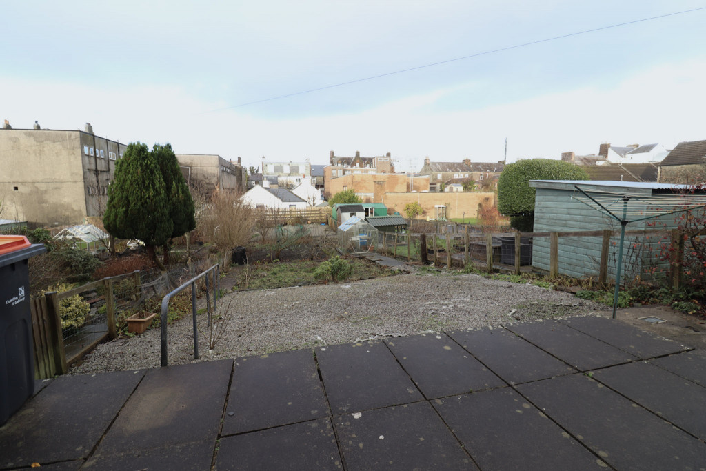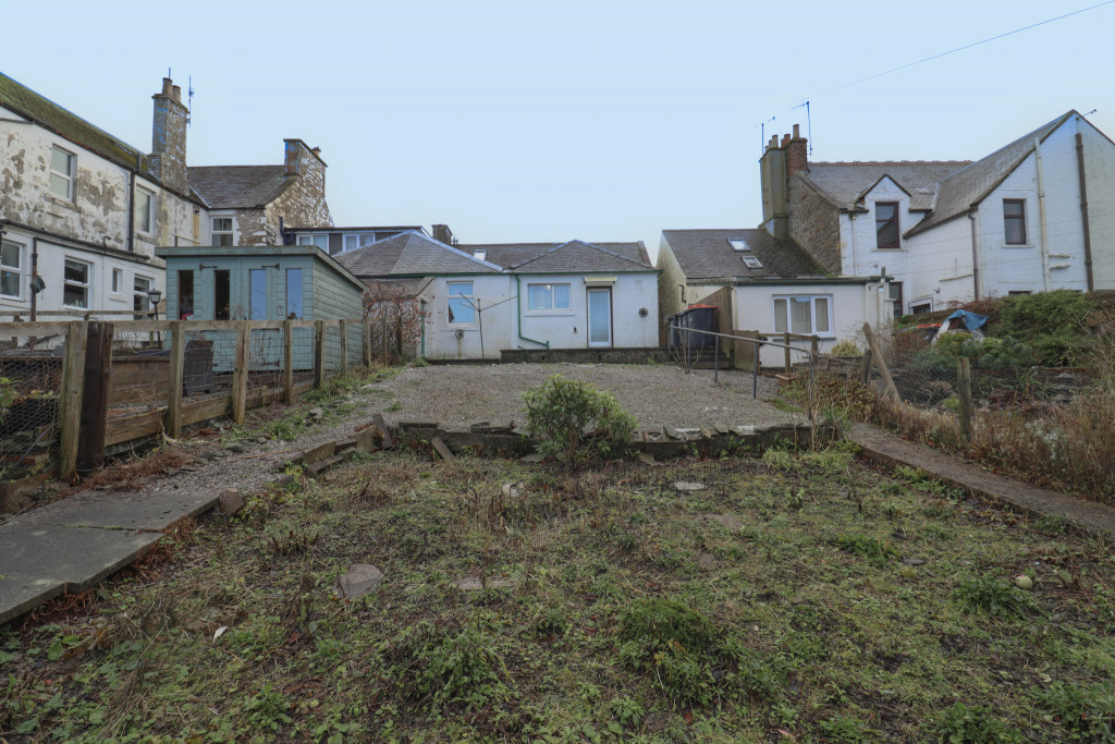 The rear garden comprises an elevated paved seating area, a pathway at the side leads down to a large flower bed, vegetable garden, greenhouse and large gravelled area. A side gate gives access to a shared pathway alongside the property, to a further side gate leading on to Queen Street.