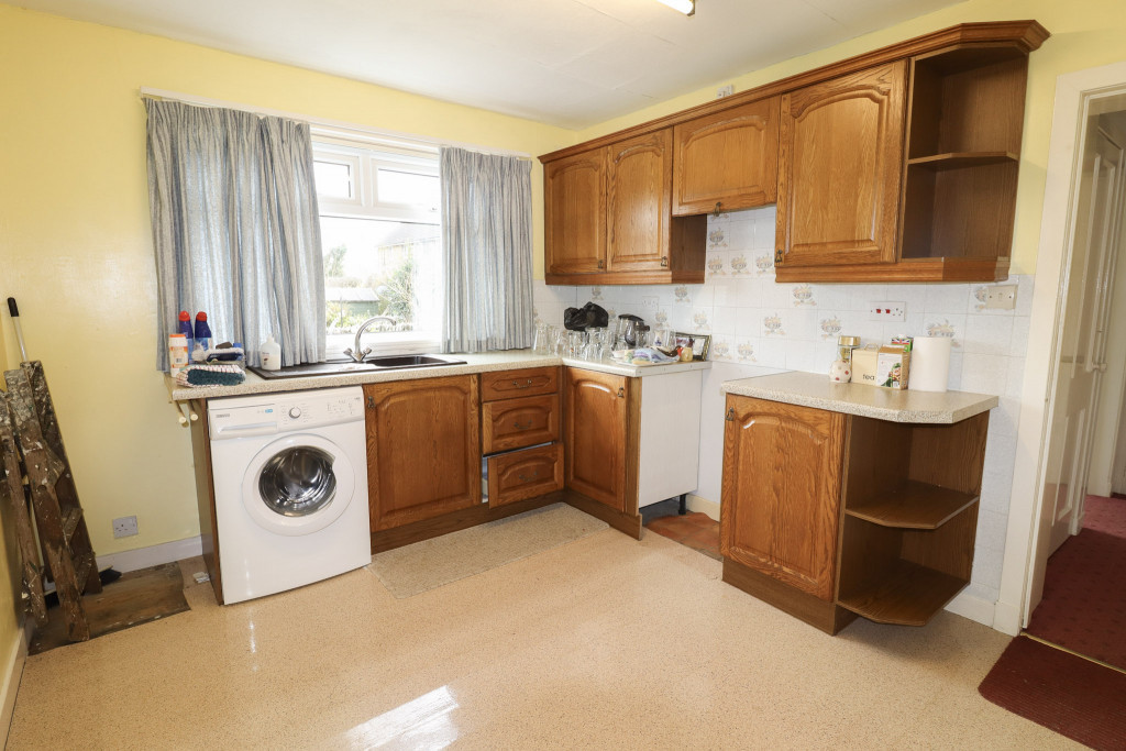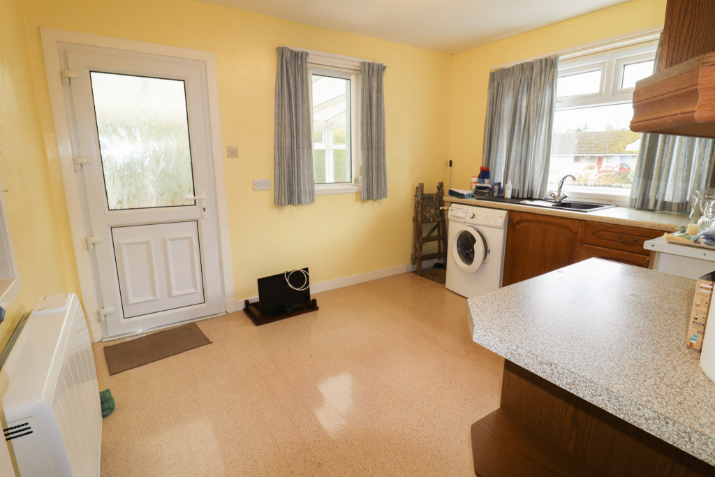 Bright room with window overlooking the rear garden and window to the side (to the conservatory); natural wooden fitted wall and floor units incorporating sink unit and drainer with a complementing worktop and a tiled splash-back; space for cooker with extractor hood above; space for fridge freezer and washing machine; shelved recess; heat detector; vinyl flooring; Dimplex electric heater; part obscure glazed UPVC external door to the Conservatory.