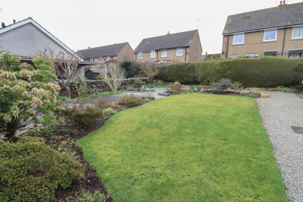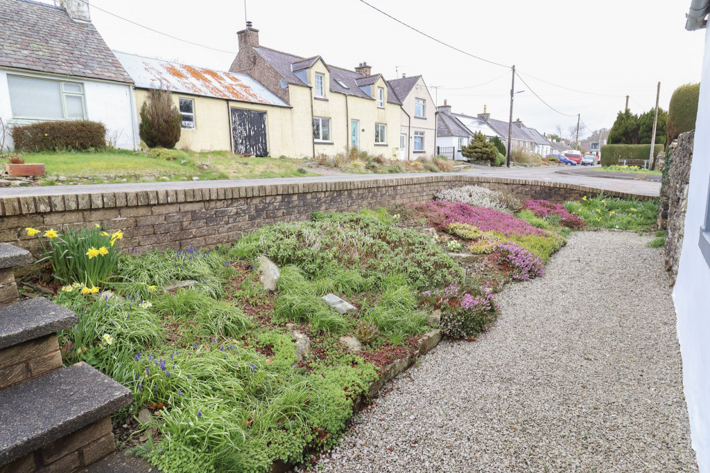 With pretty borders on each side, steps lead down to a gravelled pathway and the front entrance of the property with outside light.
