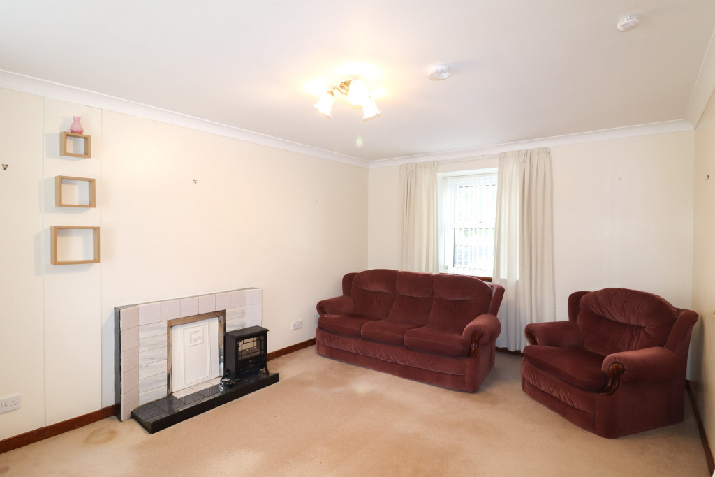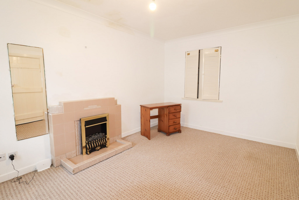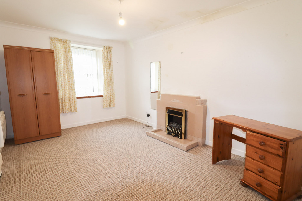 Comfortable room with windows to the front and rear; tiled fire-place (currently blocked off); television aerial connection; smoke detector; coving; fitted carpet; Dimplex electric heater.