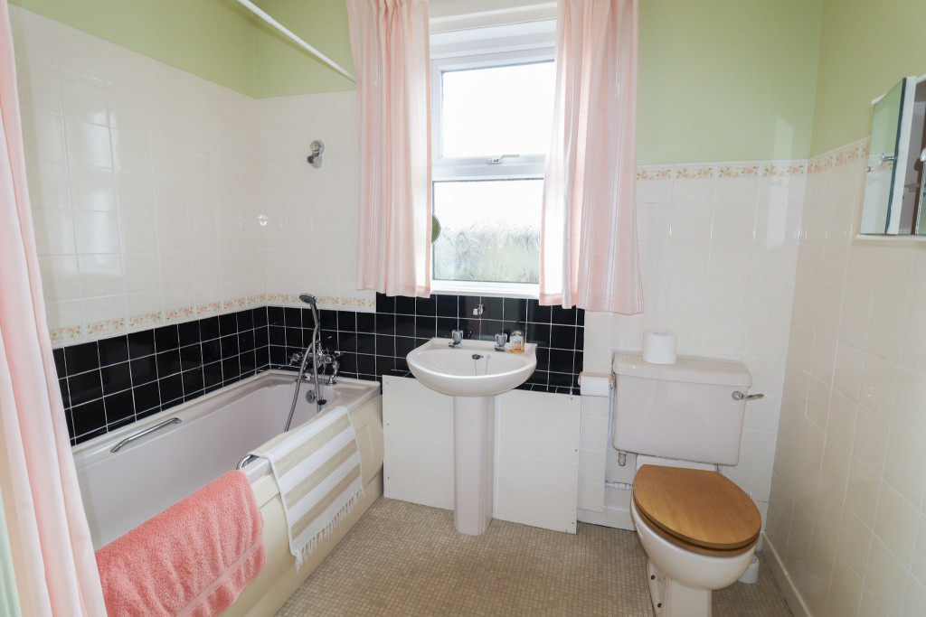 Obscure glaze window to the rear; coloured suite of bath with shower attachment and a tiled splash-back, curtain and rail, w.c. and wash-hand basin; fitted shelved storage cupboard; fitted wall mirror; vinyl flooring; Dimplex wall fan heater.